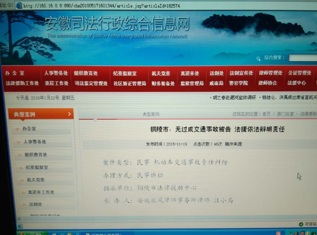 2015年承办的一起法律援助案件,案件结果反响巨大,被列入“安徽省十大案例”之中。